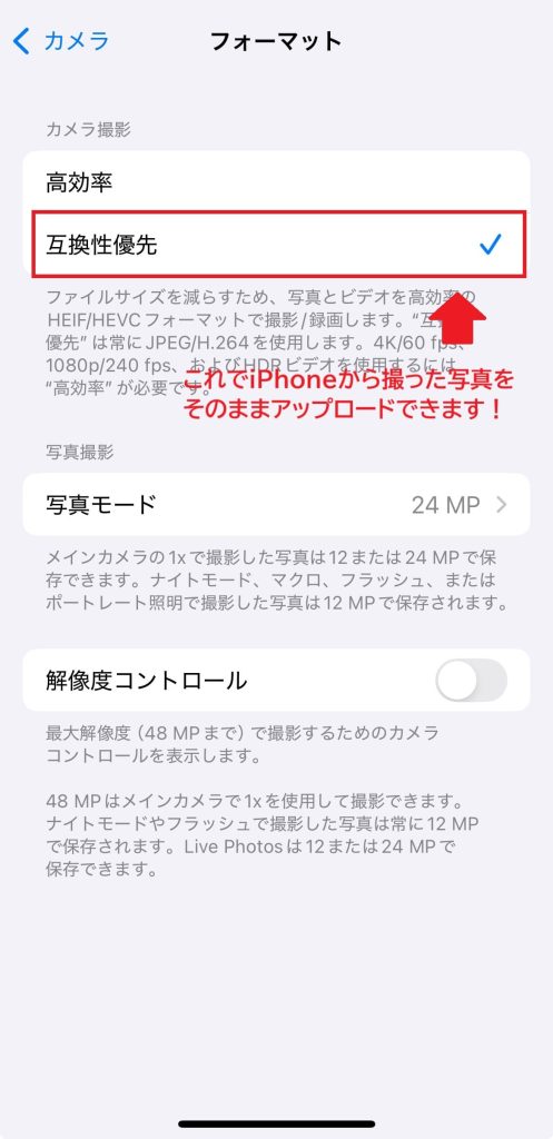 エアペイでアップロードできる写真はJPEGかPNGになので、事前にiPhoneの設定を確認してください。