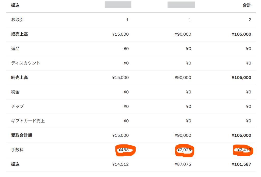 スクエアの明細画面ですが、非課税のため手数料に税込み、税抜きの表示はありません。