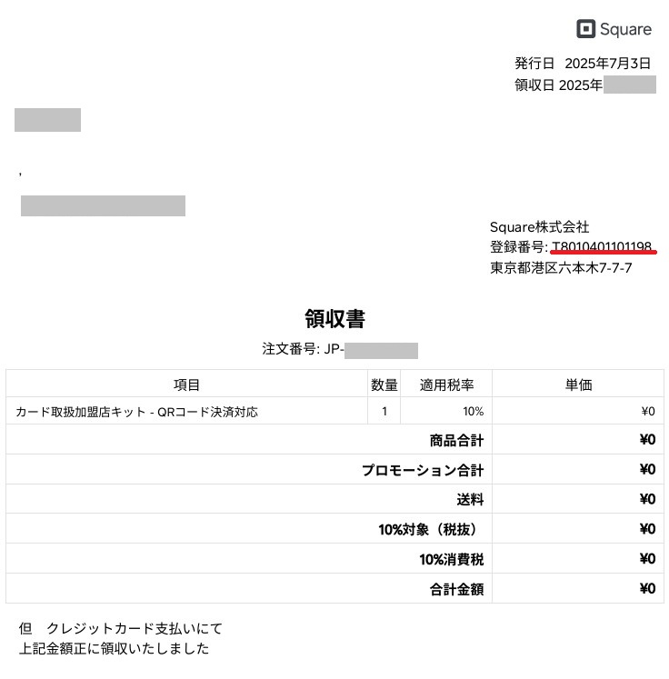 課税になる取引では、スクエアの登録番号もちゃんと領収書や請求書に記載されていますよ。