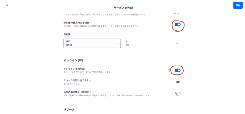 【予約後の延長時間を確保】をオンにしてサービス後のインターバル時間を確保、【オンライン予約可能】がオンになっていることを確認して保存します。
